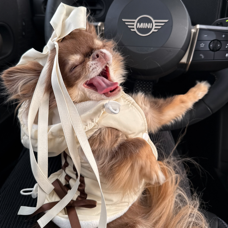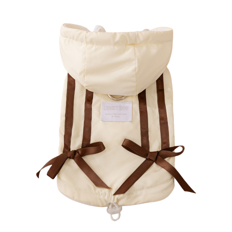 This cream hooded vest features a lightweight padded design with brown ribbon details and a built-in leash clasp for easy walks. Comfortable, adjustable, and perfect for cooler days.