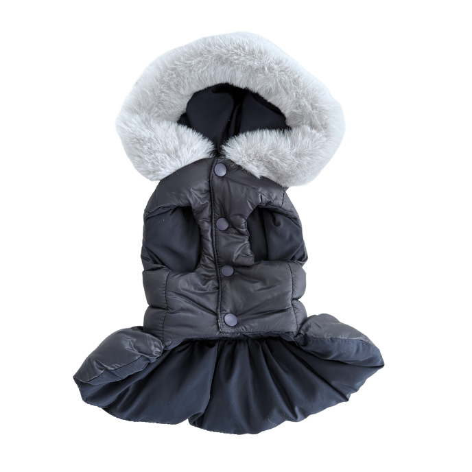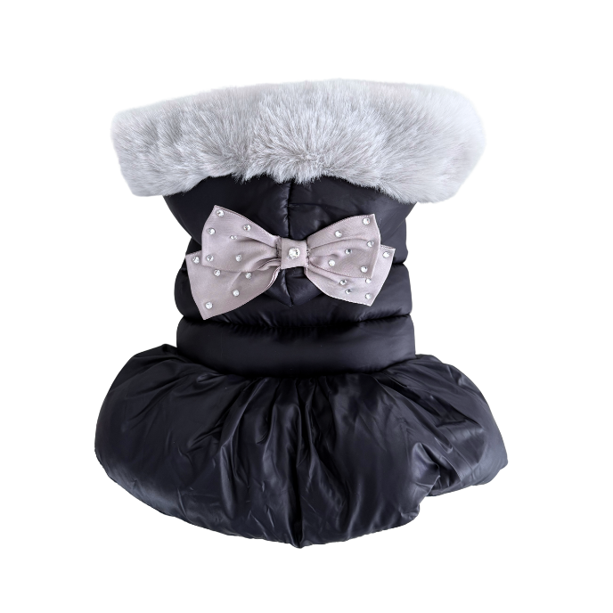 Our Puffer Bow Dress Jacket is the ultimate cold-weather statement piece—designed to keep your pup cozy while turning every sidewalk into a runway. Featuring a luxe quilted puffer body, a soft faux-fur hood, and an adorable dress-style skirt, this jacket blends function and elegance effortlessly.